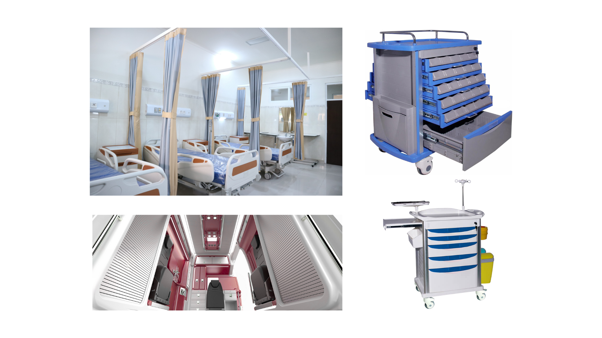 Hastane yataklarının plastik aksamları, ambulans içi kaplama parçaları, acil müdehale arabaları